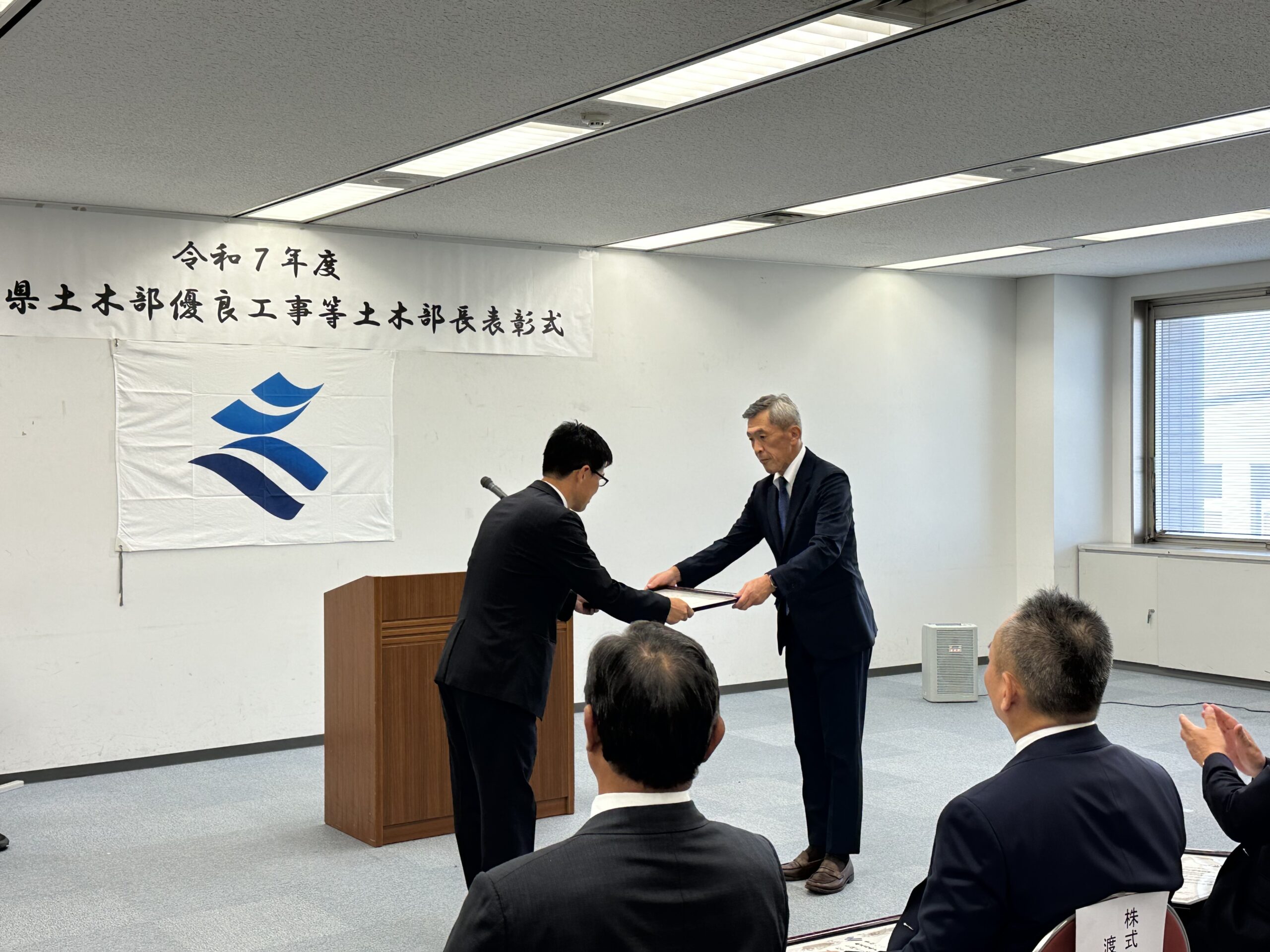 二件の工事を、優良工事として表彰して頂きました。また、県建設部発注の工事では、担当技術者が優秀技術者として表彰されました。