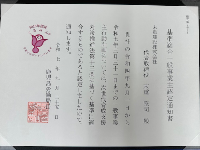 この度、厚生労働省様より、次世代育成支援企業として、『くるみん認定』を頂きました。