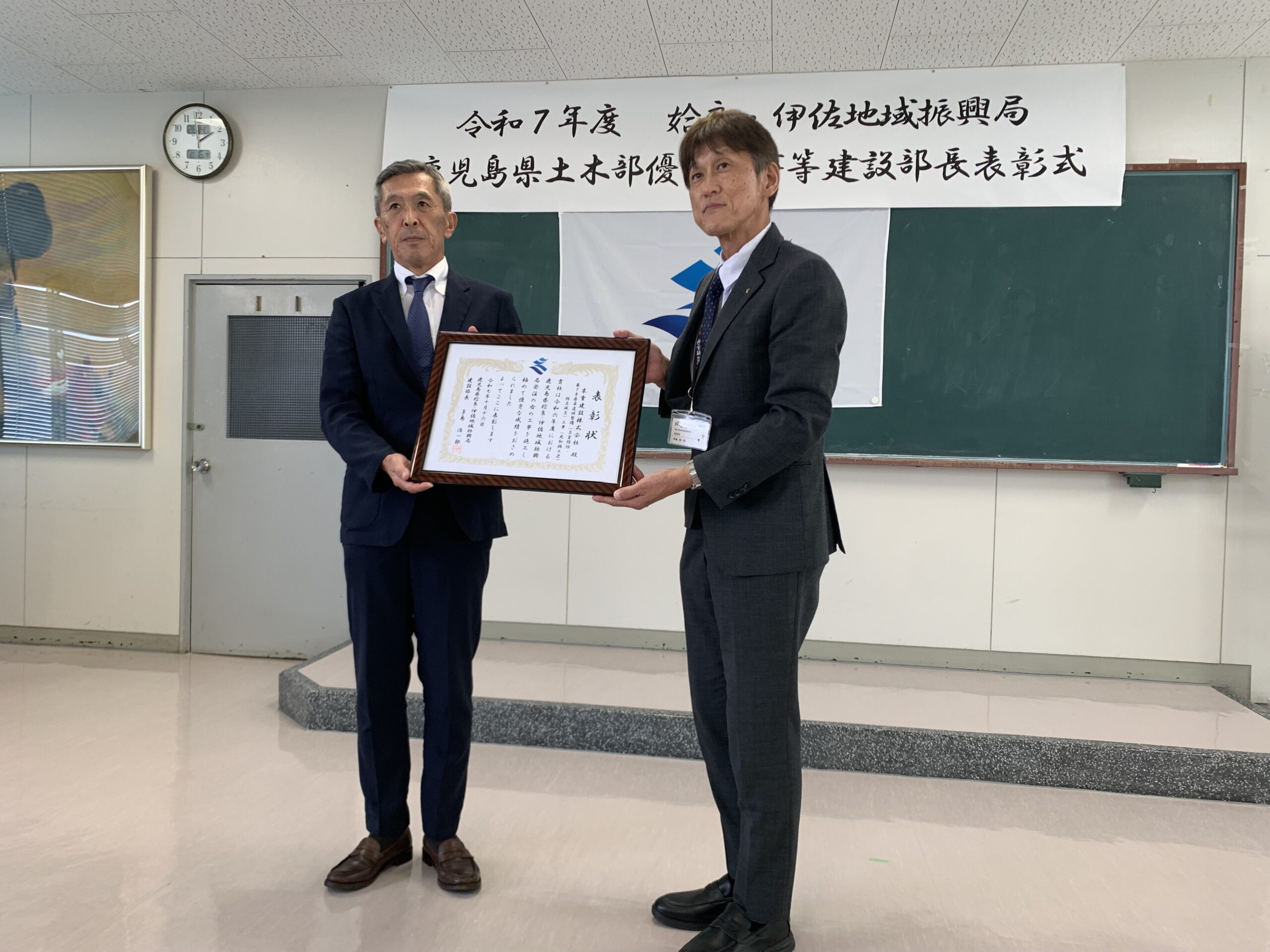 令和7年10月16日、弊社施工、災害防除工事が、鹿児島県姶良伊佐地域振興局建設部長表彰を頂きました。